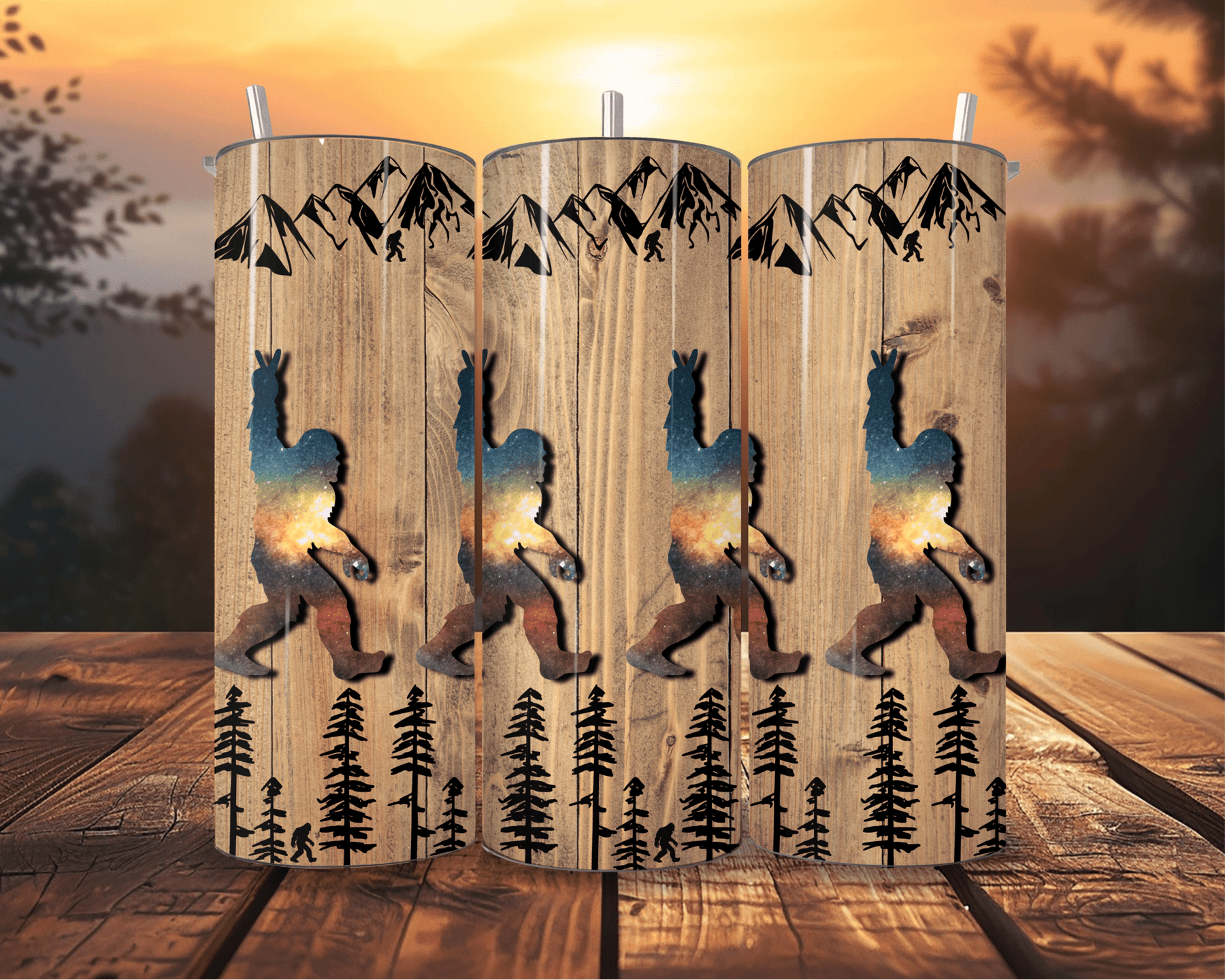 Make a bold statement with this 20oz "Bigfoot Galaxy Peace Sign" Skinny Tumbler! Featuring a unique combination of rustic woodgrain textures, vibrant galaxy-inspired Bigfoot silhouettes, and peaceful mountain and forest accents, this tumbler is perfect for Bigfoot enthusiasts and outdoor adventurers.