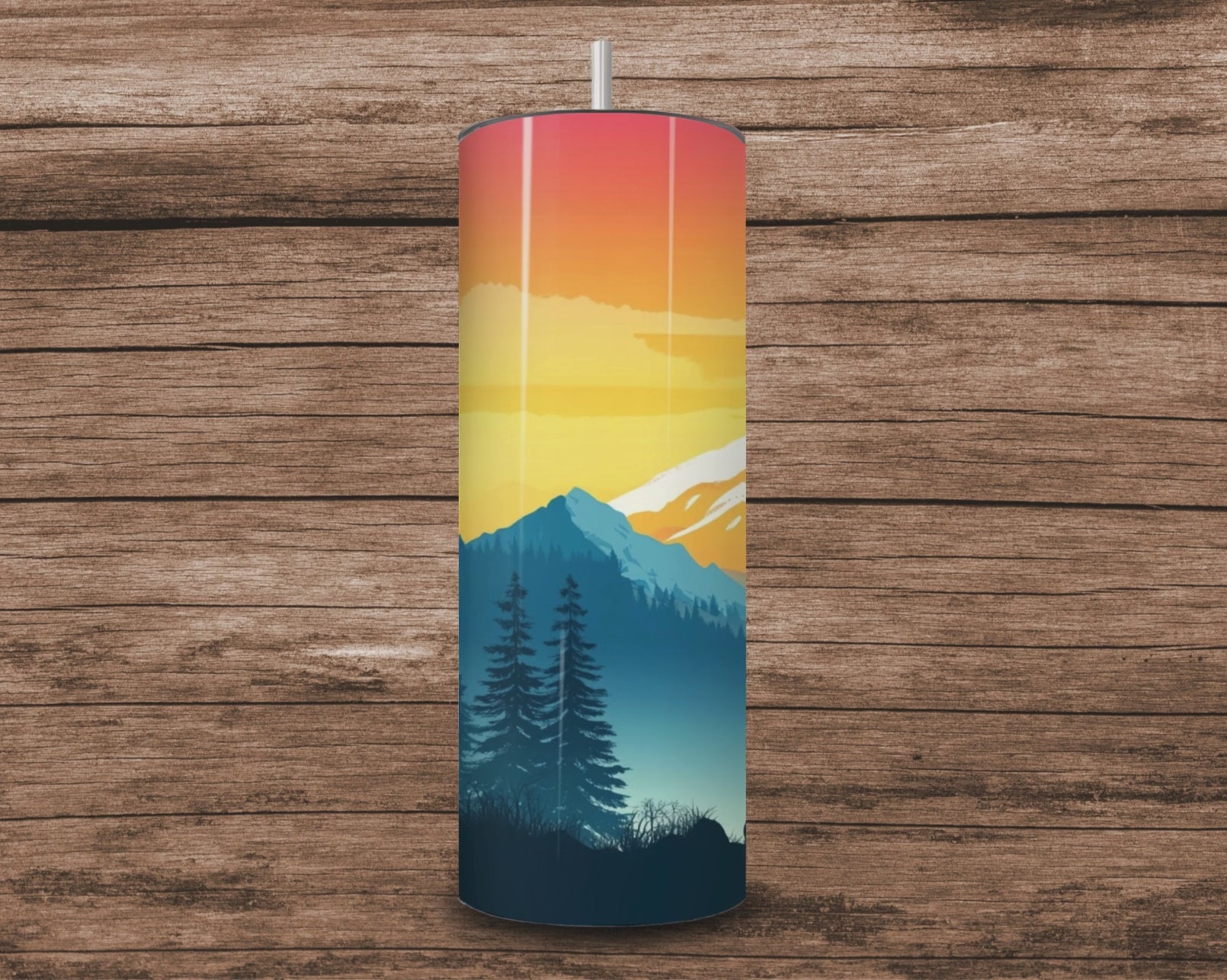 Embrace the call of the wild with this 20oz "Mountain Sunset Adventure" Skinny Tumbler. Featuring a breathtaking silhouette of a hiker and their dog set against vibrant layers of a mountain sunset, this tumbler is the perfect companion for adventurers, nature lovers, and outdoor enthusiasts.
